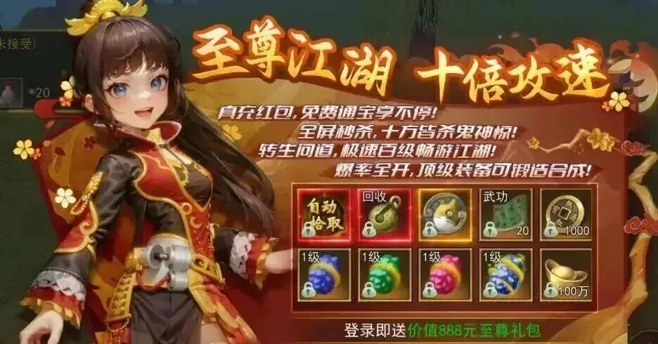 游戏最大的亮点莫过于 “高爆率”和“高攻速” 这两大核心机制。相比于传统版本,小怪掉落蓝装的概率大幅提升,世界BOSS更是藏着无数神兵利器。而十倍攻速的加入,则让战斗节奏变得飞快,无论是刀客的狂风斩还是弓手的连珠箭,技能衔接行云流水,打击感瞬间拉满。