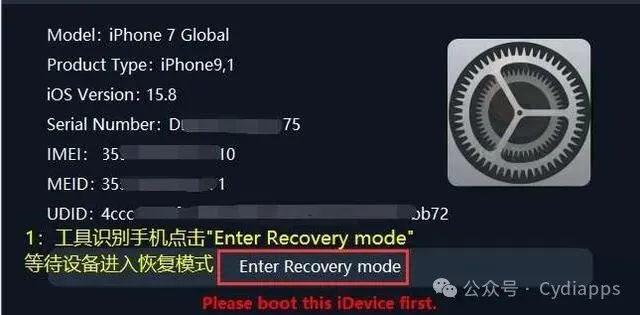 1.确保设备版本是iOS12.5 -16.7.x,下载iBypass LPro解压到电脑上,打开iBypass LPro等待识别设备,点击“Enter Recorvery mode”2.此时设备处于恢复模式,点击“Boot Device”。3.点击“Start”,根据提示操作进入DFU模式。4.设备进入DFU模式,如下图,此时不要操作设备,等待设备自动重启。5.等待工具出现“Boot Successfully!! wait iDevice reboot...”。6.等待工具弹窗出现下图,则表示支持。找代购提供序列号进行注册非此弹窗提示请自行翻译重新尝试