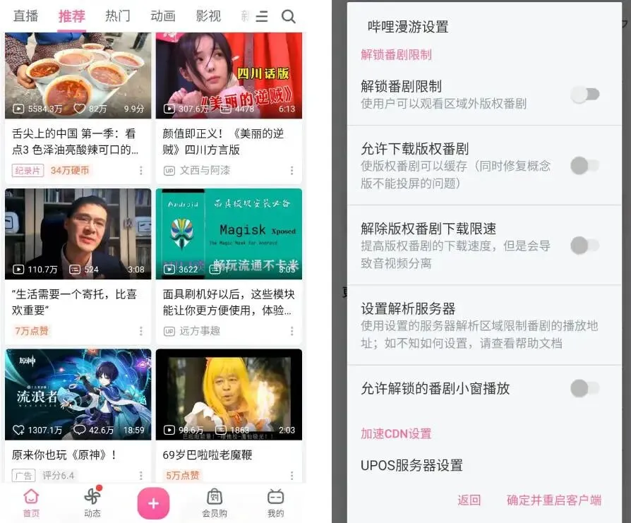 标识“Xposed Without Modules”为带框架无内置模块版,需自行安装哔哩漫游使用;