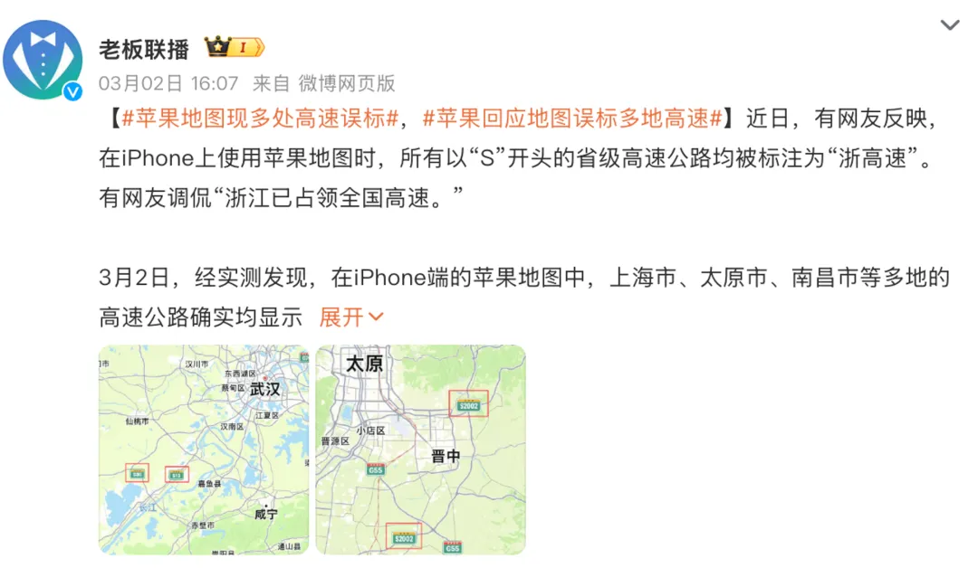 你以为地图最怕的是把人带错路,其实对大公司来说,更尴尬的是那种谁都能一眼看出来的低级错误,最近苹果地图碰上的恰好就是这一种,这两天不少人打开 iPhone 自带地图,把画面放大到高速路段后,看到的是同一种离谱画面,明明人在别的省绿色省级高速牌上写的却还是浙高速,这个问题在3月初被集中讨论,外部实测提到上海,太原,南昌等地都能看到类似情况,苹果客服也回应过确认这是显示异常原因还要交给技术人员继续查