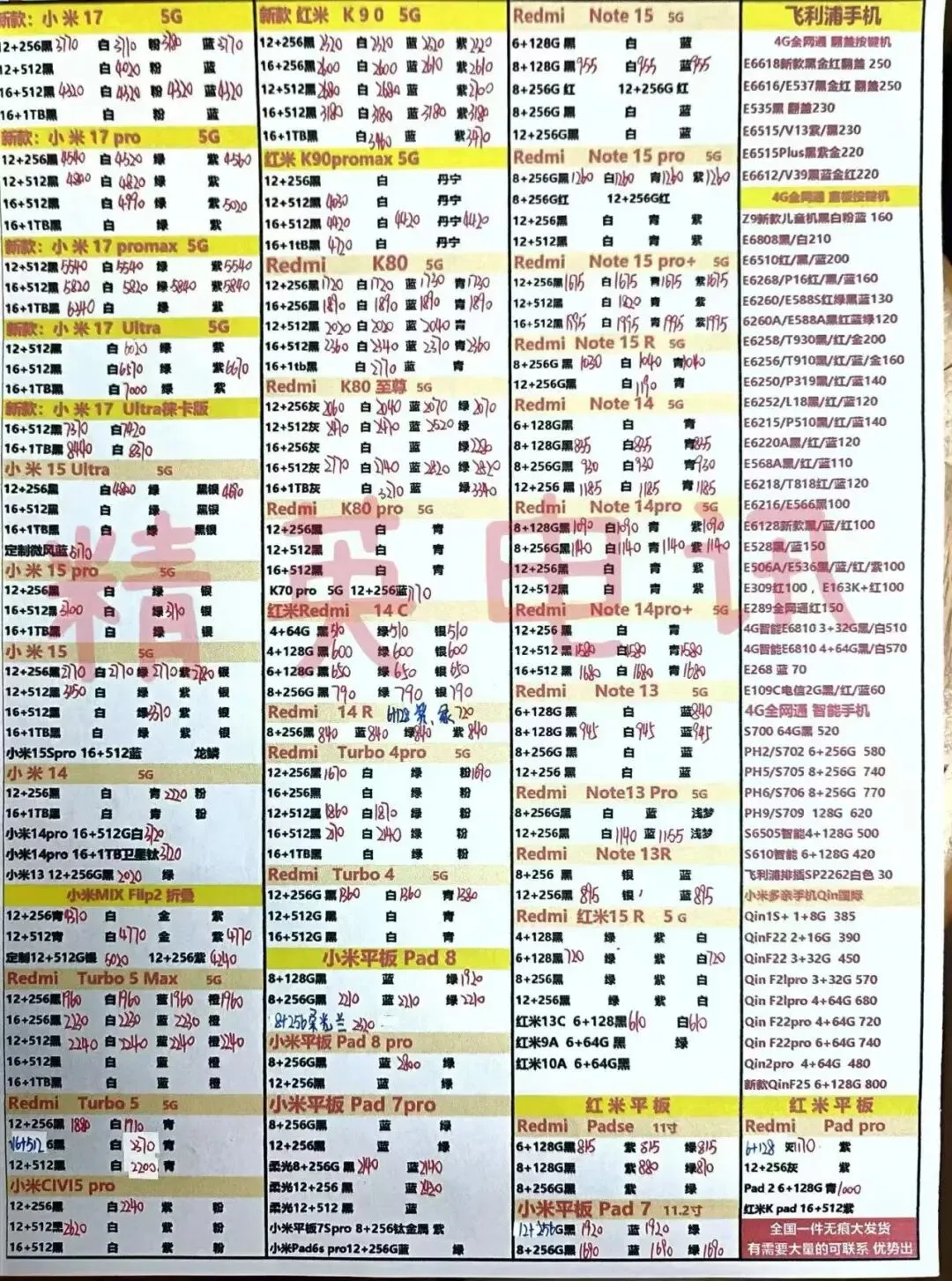 以下报价都是深圳华强北手机批发市场当天的最新批发价格(不含税),报价是我们的批发底价,零售拿货价格需加20~100元不等,京东包邮(量大价格可谈)