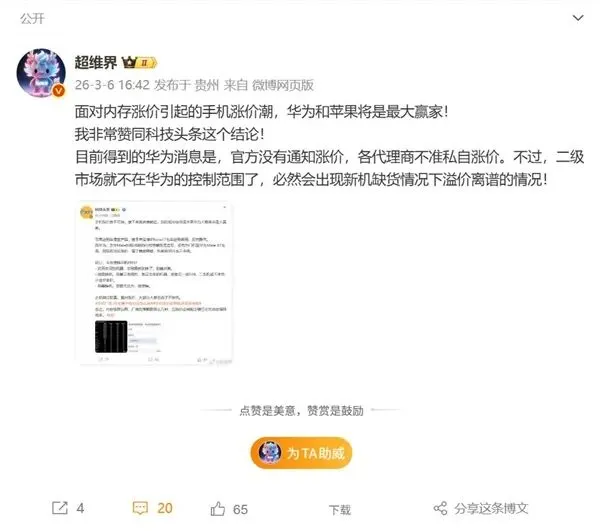 在这波汹涌的涨价潮中,华为和苹果反而展现出了极强的市场韧性。有博主透露,华为内部目前并未下发任何涨价通知,并明确严禁各级代理商私自加价,力求维持终端价格的稳定。