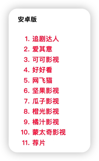 包含爱其意、好好看、坚果影视、瓜子影视、荐片、大师兄影视等。以上软件均支持安卓或TV平台,可根据场景需求选择。