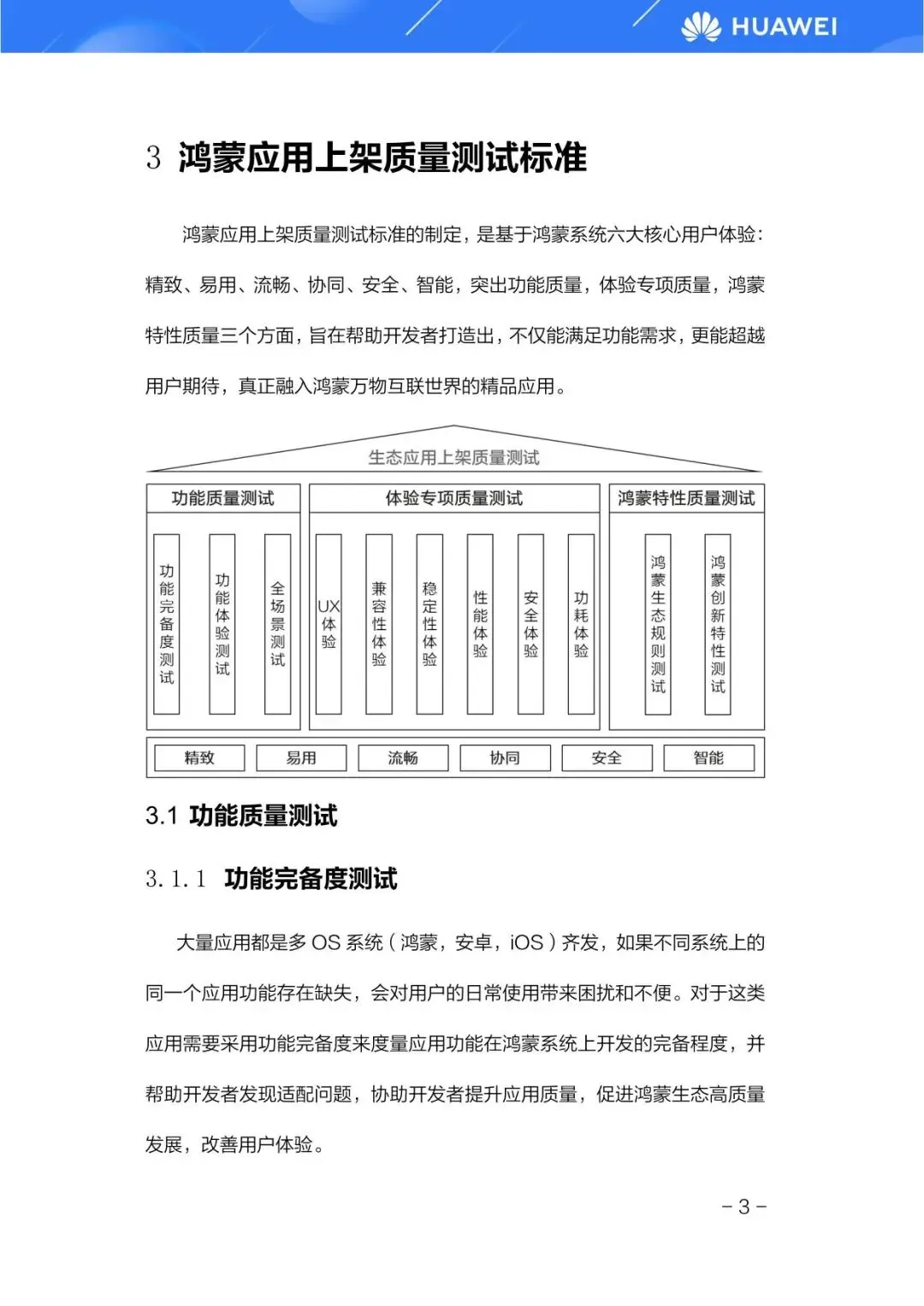 白皮书的核心内容在于构建了一套全面、细致的鸿蒙应用上架质量测试标准。该标准体系围绕鸿蒙系统追求的精致、易用、流畅、协同、安全、智能六大核心用户体验,从三个维度展开。首先是功能质量测试,确保应用功能完备、体验流畅,并支持全场景无缝流转。具体包括功能完备度测试,即对比鸿蒙版本与其他系统版本的功能一致性;功能体验测试,针对26个应用垂域制定关键体验路径与指标;以及应用全场景测试,验证应用在多种设备形态下的适配能力。