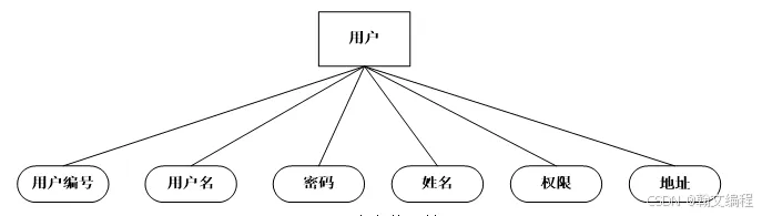 用户信息实体,主要包括用户编号,用户名,密码,姓名,权限,地址,电话 等信息实体。如图4.3所示:
