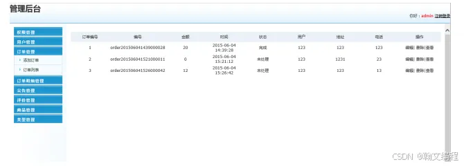 该功能用于实现对系统订单信息的管理。可以添加、删除和更改订单信息,以及订单信息列表展现,在添加订单信息时,系统会自动查询系统中订单表中的订单编号字段,系统自动将订单表中最大值加1作为该订单表订单记录的订单编号,同时将订单编号,编号,金额,时间,状态,用户,地址,电话信息添加到订单信息表中;在删除一条订单记录时,先选中一条订单记录,将该条订单记录中的订单编号作为查询条件在订单信息表中进行查询,弹出“确定要删除吗?”的对话框,若是,则执行删除操作,否则退出删除操作;在更改订单记录时,先选中一条订单记录,将订单信息显示在相应的修改页面中,然后更改后保存到订单信息表中;查看订单信息记录时,选中要查看的订单记录,系统根据用户选择订单信息,在详细页面显示订单信息