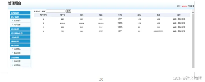 普通用户或管理员输入自己的用户账号、密码,通过身份验证后可以进入相应的管理界面首页。管理员管理页面分为权限管理、用户管理、试商品题管理、订单等功能。普通用户在手机端可以注册登录,查看商品、进行购买商品的功能。