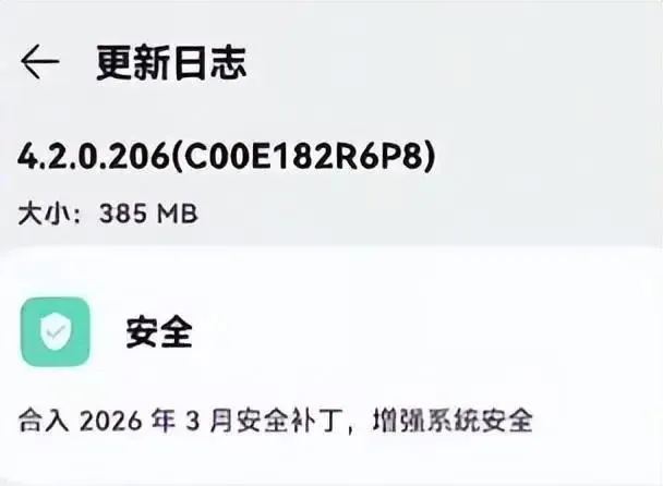 - 加粗共7处(385MB;4.2.0.206;2026年3月安全补丁;4.2.0.205;≥50%;10–15GB;老设备可再战1–2年),均为硬数据或锚点。