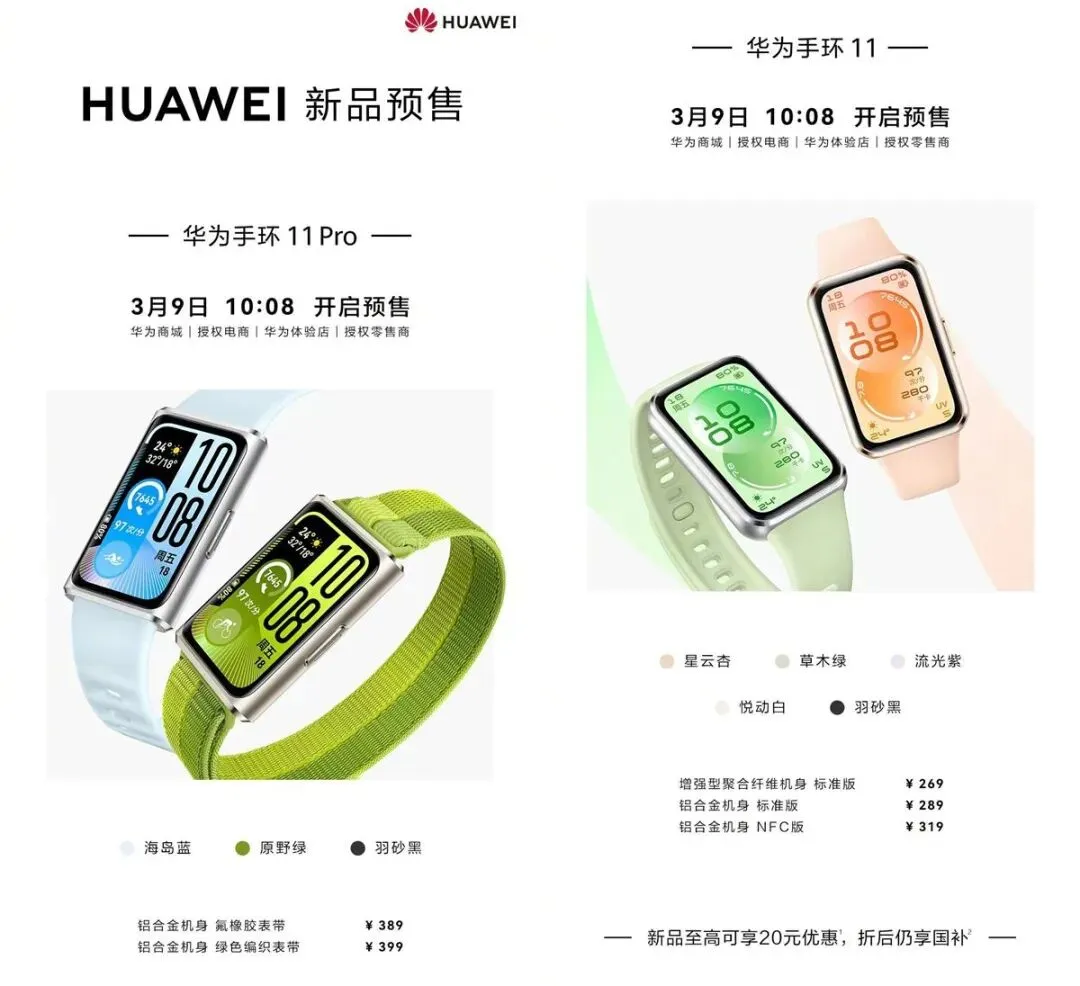 3月9日,华为手环11系列开启预售,搭载鸿蒙OS 6,正式首销定在3月18日同一时刻。
