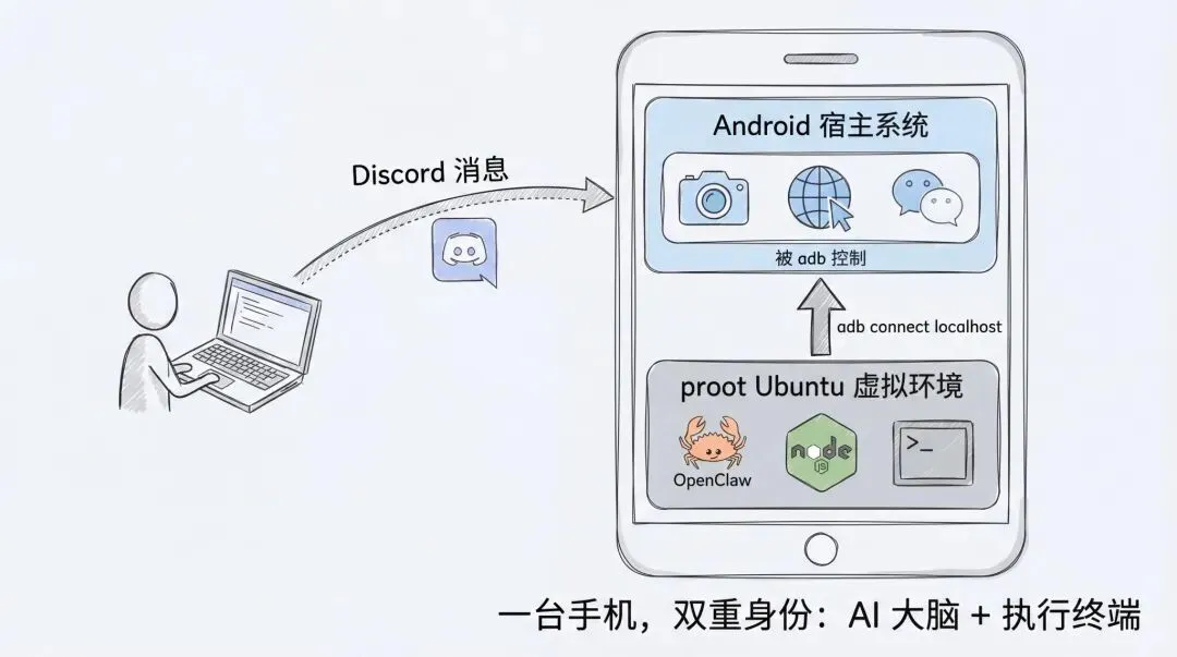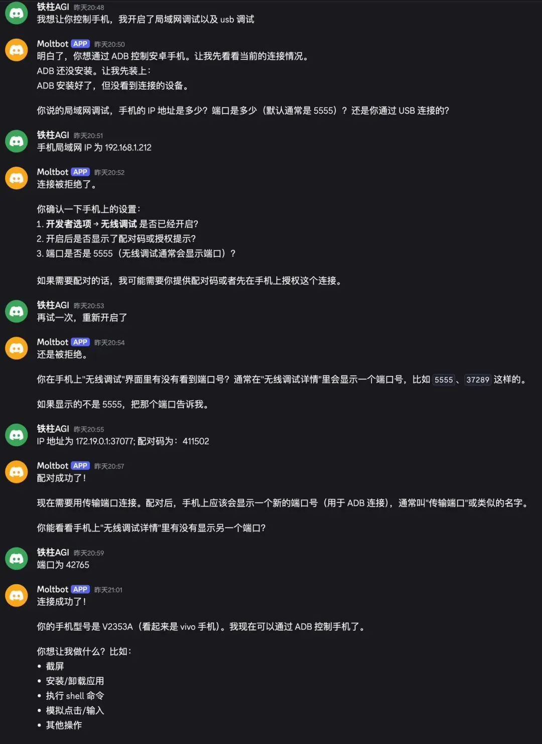 一机两用:该设备既是 AI 服务器,又是自动化执行终端。通过 Discord 对话,即可让 AI 控制手机完成拍照、启动应用程序、操作浏览器等任务。