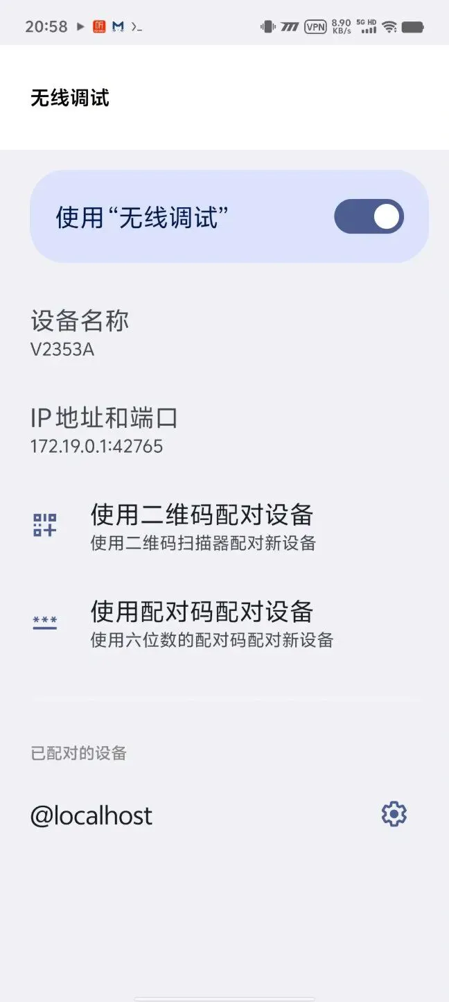 要让虚拟环境中的 OpenClaw 通过 adb 控制宿主系统,需要在手机上开启无线调试,然后让 adb 连接到 localhost(自己)。