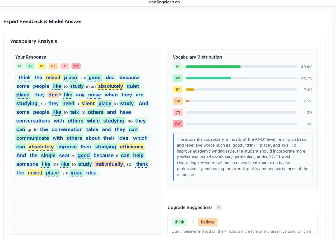 写作是一个邮件和一个小作文。邮件可以准备一些语料和打字速度,需要一些想象力,打字速度慢和临时想内容可能会耽误时间,只有7分钟,有点小紧张。小作文的话题更加灵活和与时俱进,而不是一些常规话题。lingoleap写作ai评分很详细,对于改进的建议也非常详细,挺适合自学需要ai批改的宝子用。