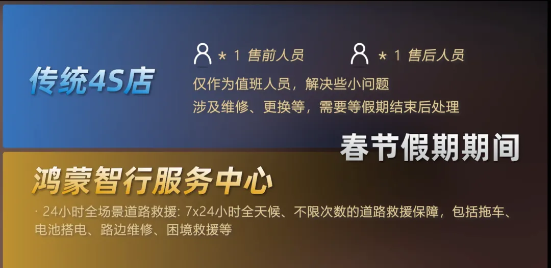 这种服务,有些品牌也会提供。但通常来说,春节假期期间,传统4S店一般只会留一个售前,一个售后作为值班人员,开车去店里,他们能解决些小问题,如果要涉及维修、更换,通常都是“开工再说”。而鸿蒙智行承诺提供7*24小时全天候、不限次数的道路救援,不仅包括拖车,还有搭电、路边维修、困境救援等等。