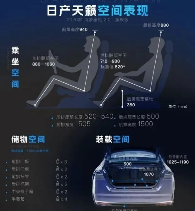空间方面,新款天籁鸿蒙座舱版的车身尺寸基本保持不变,长宽高分别为4920mm、1850mm、1447mm,轴距为2825mm,处于同级别车型的主流水平。实际乘坐感受上,前排座椅的填充物相比以往车型感觉稍硬,包裹性与支撑性尚可,但诸如座椅按摩等高级功能有所调整。