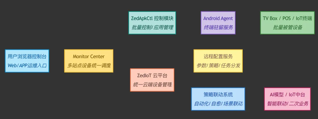 在 AIoT 时代,大规模 Android 终端的智能运维,不仅是降本增效的手段,更是企业数字化基建的重要组成部分。ZedIoT 平台凭借系统级能力、开放式架构与强大的定制化能力,正逐步成为行业标准方案。