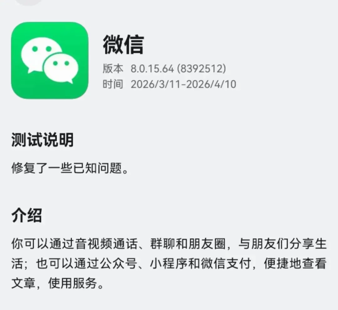 本次更新,距上一版本已过去20多天的时间。期间,@客村小蒋曾透漏,鸿蒙微信手表端会很快与大家见面。这段时间,用户反馈手表微信被内测到的情况确实增加了,所以这一版本应该是在微信手表端覆盖范围上做了调整。我认为,这也是鸿蒙微信还处于8.0.15大版本的原因所在,应该会在手表微信全量覆盖后,再进行大版本迭代。近期,文章更新比较慢,后台多了一些留言,有一些是关于鸿蒙微信现阶段不支持的功能,整理如下:5、视频号功能不完善。不支持视频号小窗口播放,横屏播放,倍速播放,橱窗等功能。虽然部分功能不属于一级功能,但是一些用户难免会经常使用,所以鸿蒙微信在用户体验上还有很大的提升空间。希望鸿蒙微信在2026年能够追平安卓/iOS 系统,虽然这中间的难度很大😂大家还有哪些经常用的功能还不支持?欢迎评论区留言。Pc/Mac系统4.1.8版本、安卓/iOS 系统8.0.69版本、鸿蒙微信8.0.15版本后台发送“微信”获取链接。