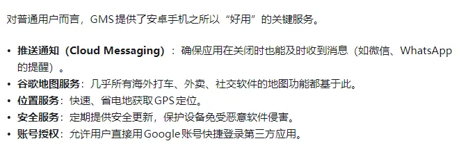 GMS是(海外)Android生态中非常核心的一部分,指谷歌提供的一系列应用、API和服务框架。它不同于开源的Android系统(AOSP),需要谷歌授权才能合法预装。