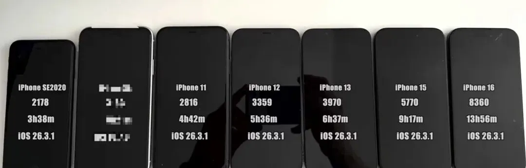 iOS 26.3.1 正式版电池续航测试,共 6 款机型:iPhone SE 2020 ,iPhone 11 ,iPhone 12 ,iPhone 13 ,iPhone 15,iPhone 16 。