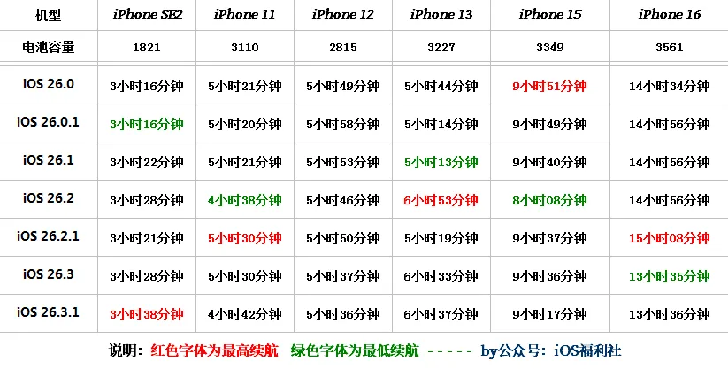 从此UP主测试结果来看,相比于 iOS 26.2.1 系统的电池续航的具体数据:iOS 26.3.1 正式版电池续航整体是下降趋势的,个别机型续航增加也是几分钟。全部的 iOS 26 系统续航水平对比数据如下图示。 注意事项