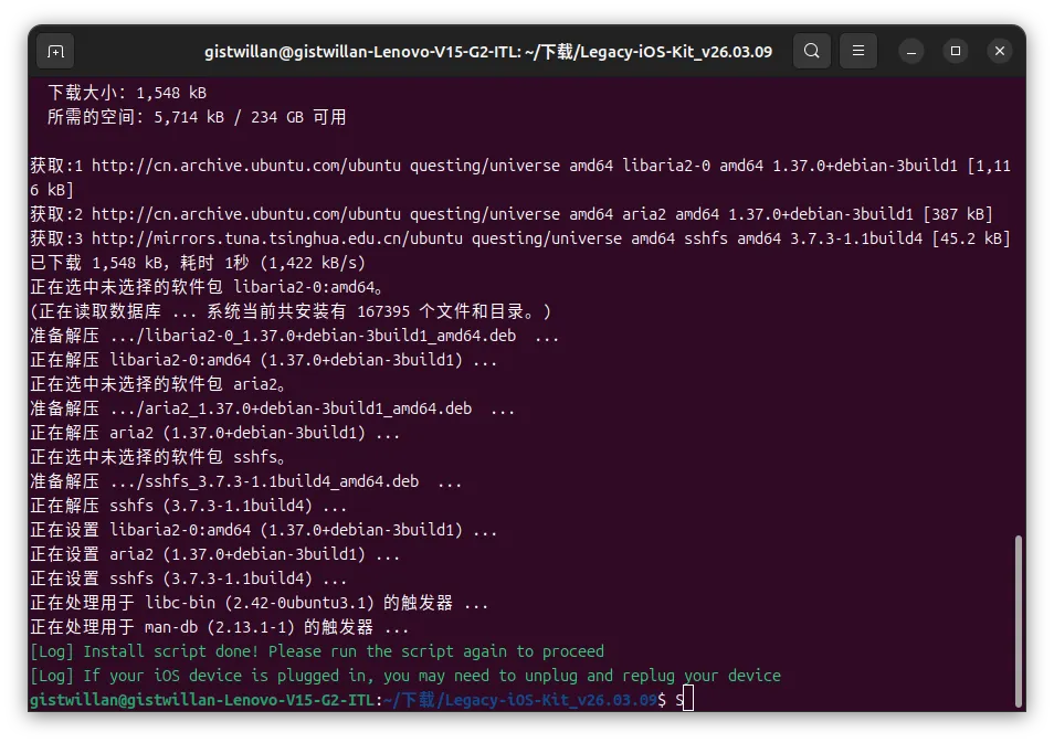 脚本会自动检查依赖,如果缺少组件,请按照提示输入密码进行自动安装,安装完成后会提醒你再运行一遍这个脚本以继续降级流程,如果设备已经插入了就重新插拔一下。