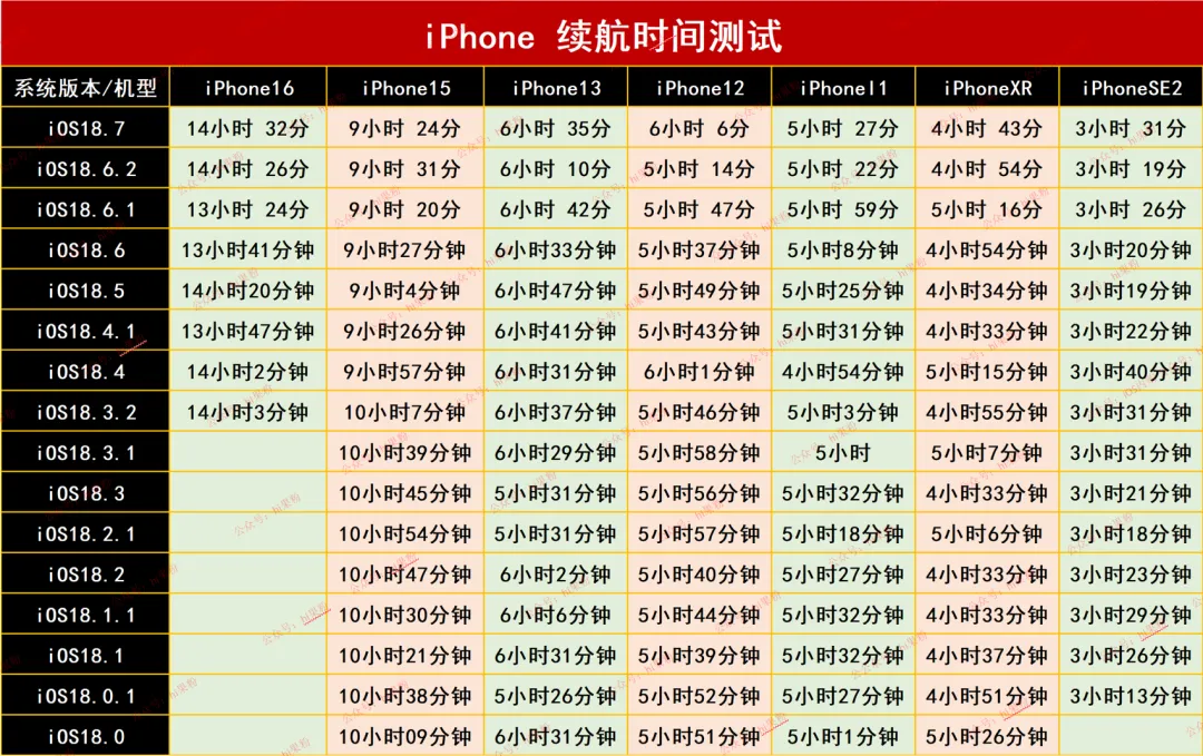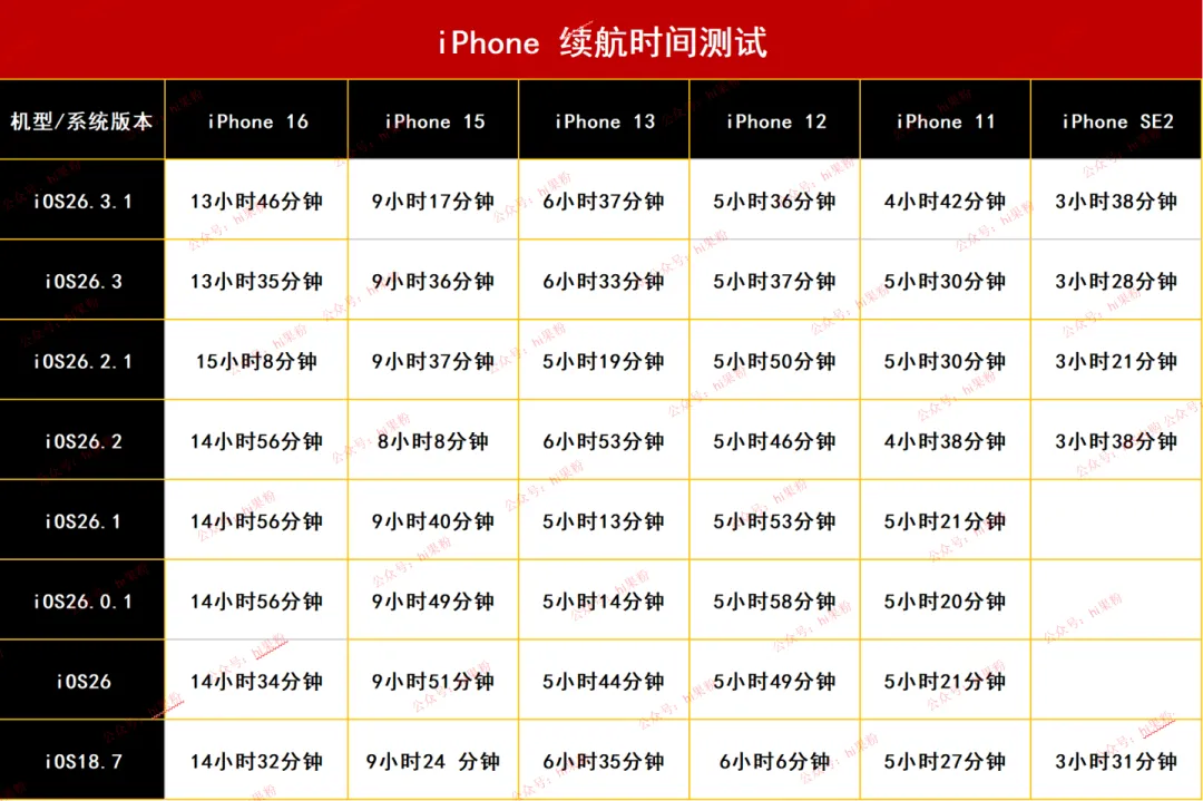 2、以上数据是 iOS 26.3.1 正式版测试结果,不代表日常使用最终结果,仅供参考;大家根据自己机型及续航测试表,考虑是否合适升级系统;