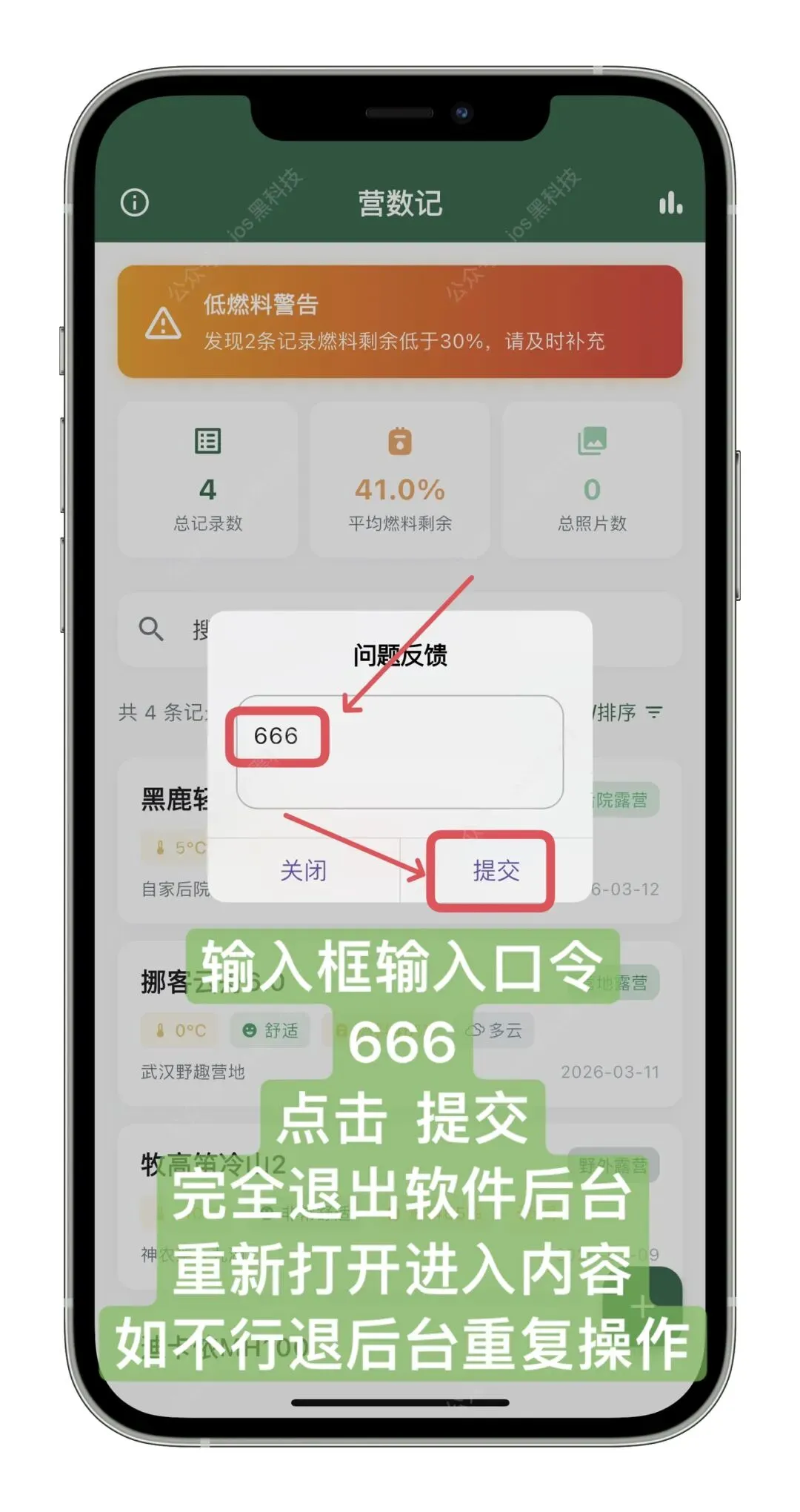 iOS 版: 左上角 反馈图标-输入口令:666 -点击提交-耐心等待5分钟(如不行请多次退出后台重复操作)
