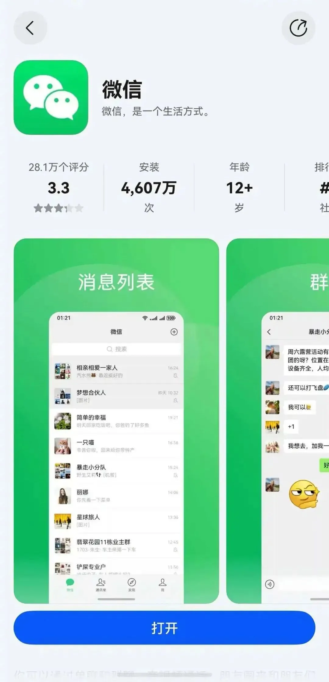 昨晚,鸿蒙微信 8.0.15.64 测试版开始分批上架鸿蒙应用市场应用尝鲜专区。