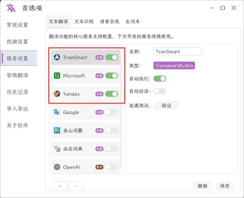 服务设置,可以选择不同的翻译源,实际使用哪个好用就选哪个。还可以点击+号,设置更多接口,比如open ai,deepseek等等设置完保存即可使用,根据自己设置的快捷键就可以开始一键截图翻译https://pan.quark.cn/s/b0d941edd7a8