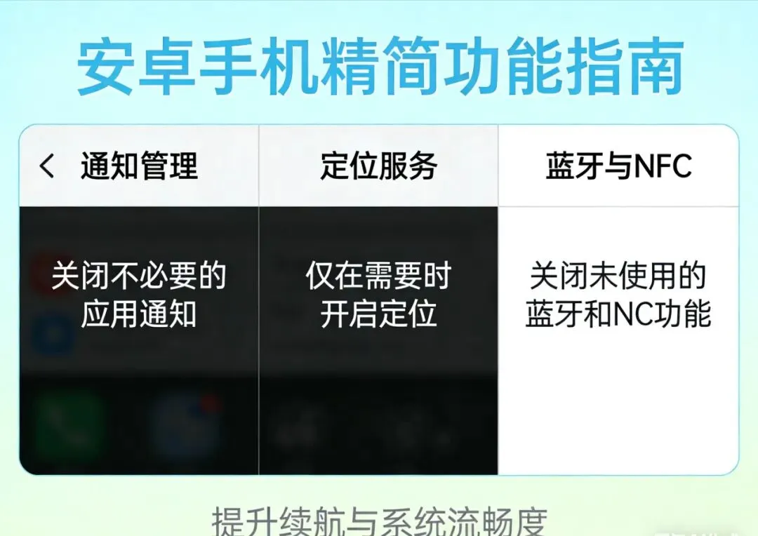 最后精简通知、定位与冗余功能。关闭不必要的消息推送,减少屏幕唤醒次数;不用时关闭蓝牙、NFC、热点;定位权限只留给导航与出行类APP,进一步降低待机耗电。