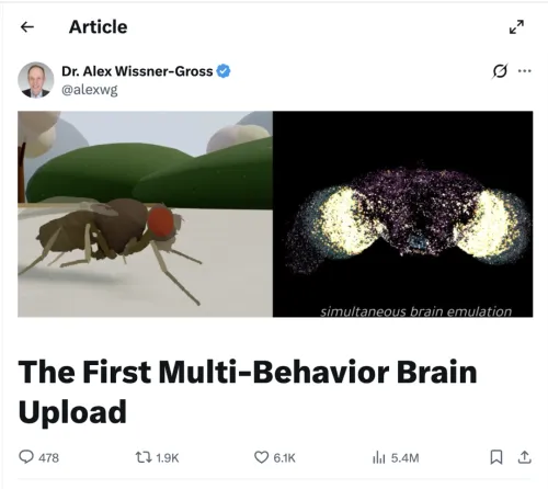 最离谱的是,这玩意儿根本没经过什么AI大模型的数据训练,纯靠复制真实的物理神经连接,它自己在虚拟世界里醒过来,就开始溜达、洗脸、找吃的,行为和真苍蝇有95%的相似度!