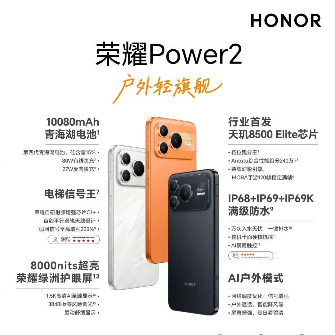 排名第一的是荣耀Power2,它的平均跑分为220.1万+,是1月份和2月份该榜单的性能王者,12GB+256GB版到手价2295元。该机的核心卖点是10080毫安时大电池,还有IP69K满级防水和SGS金标五星整机抗跌耐摔+抗挤压认证,同时在影像系统和外围配置上也有不错的表现,适合喜欢超长续航的中端手机用户。其实同价位的荣耀WIN RT更值得推荐,遗憾的是目前电商平台已经处于缺货状态,都是存储成本上涨导致的。