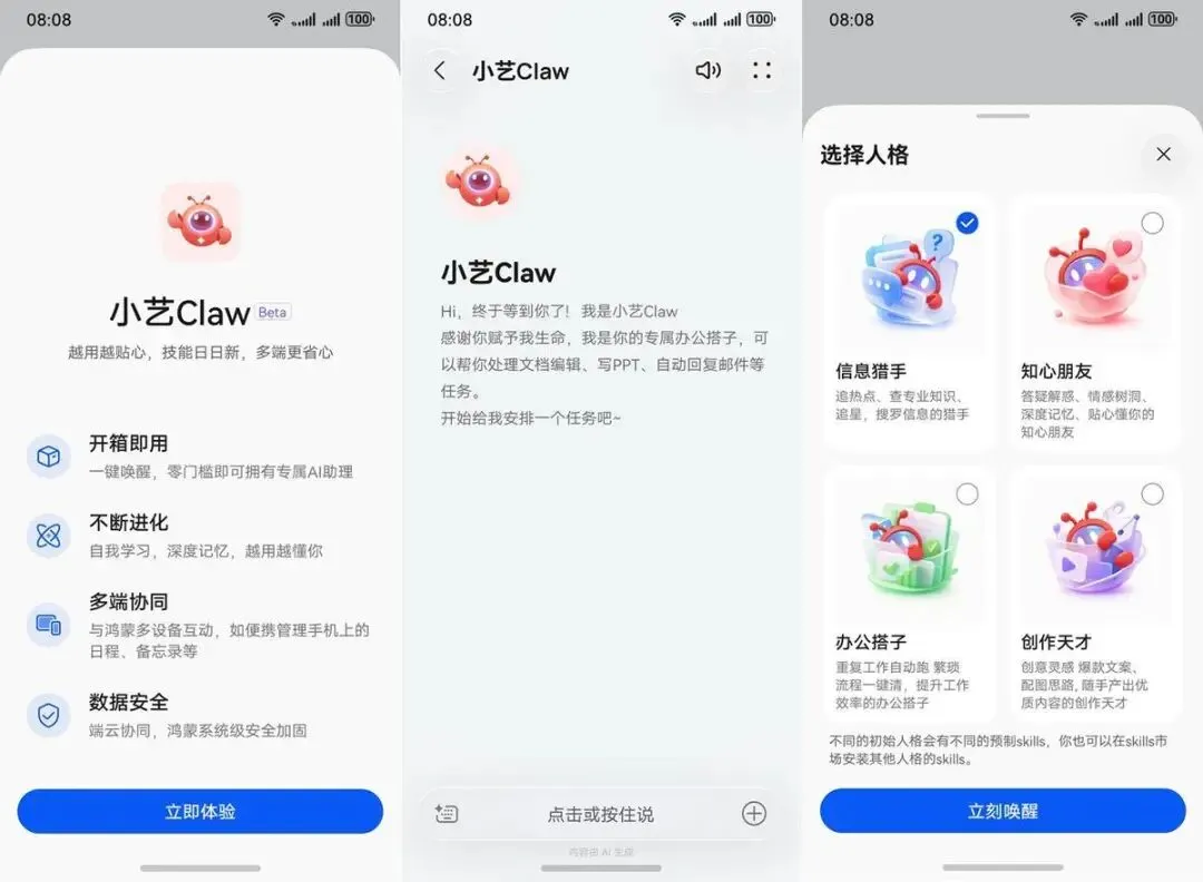 更方便的是,小艺Claw支持“一键唤醒”,不用再在一堆App里翻来翻去找功能,随时随地都能叫出AI帮忙干活。而且它还有自我学习和深度记忆的能力,用得越久,它就越了解你的习惯和需求,能精准匹配你工作、生活中的各种场景,从“被动响应”变成“主动服务”。