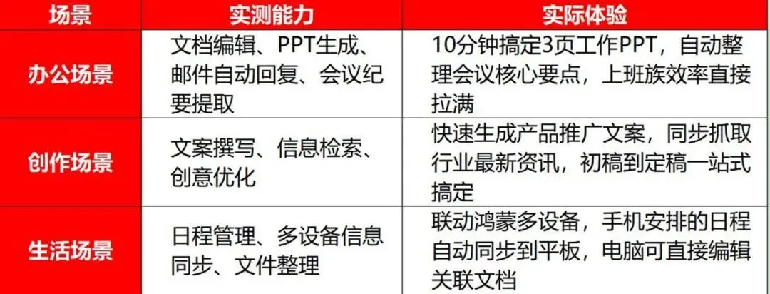 传统AI在实际使用中常常看起来挺厉害,但用起来却有点“中看不中用”。而小艺Claw的表现就完全不同了,实测下来真的像个“全能助手”,能覆盖办公、创作和生活这三个大场景。每个场景里,它都有自己的亮点,体验也很不一样,具体来看: