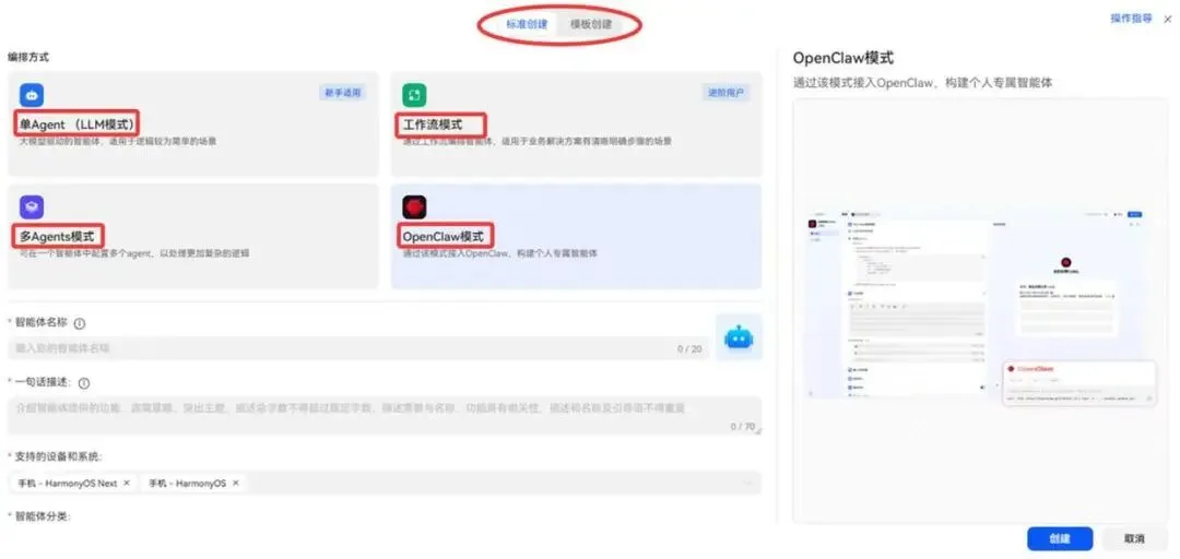 何刚晒出来的界面显示,小艺Claw主打的是“零门槛”体验。普通用户不用懂什么高深技术,只要按照三步就能轻松拥有一个7×24小时随时待命的AI助手:打开小艺App,点“新建智能体”,然后选“标准创建”,接着在“编排方式”里找到并开启OpenClaw模式,最后接入OpenClaw框架,一键生成属于自己的智能体,想用的时候随时唤醒就行。
