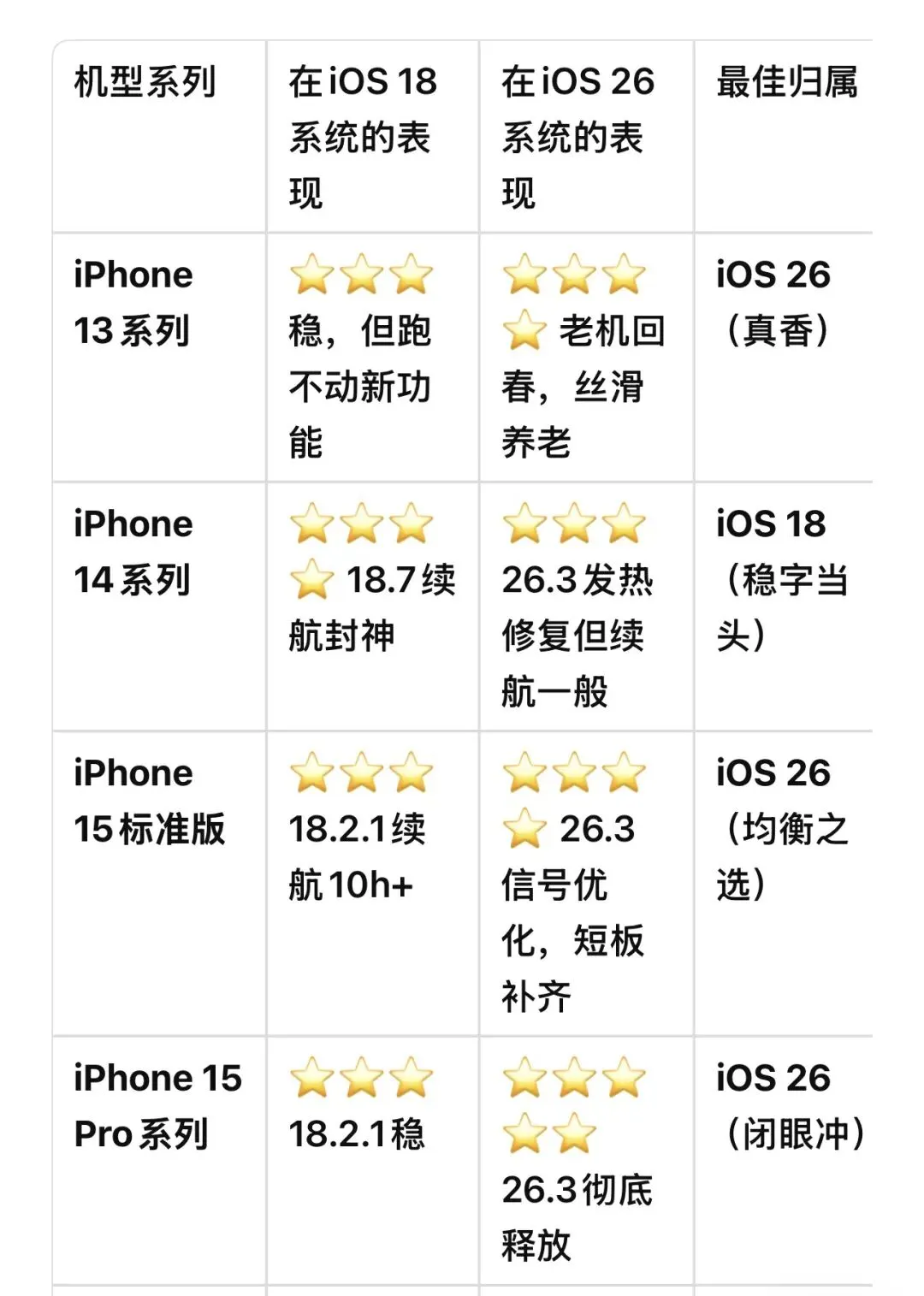 这个问题太经典了!iOS 18是2024年的系统,主打稳定省电;iOS 26是2025-2026年的系统,主打新功能+性能释放。但不同机型在两个系统上的表现,简直是天壤之别!