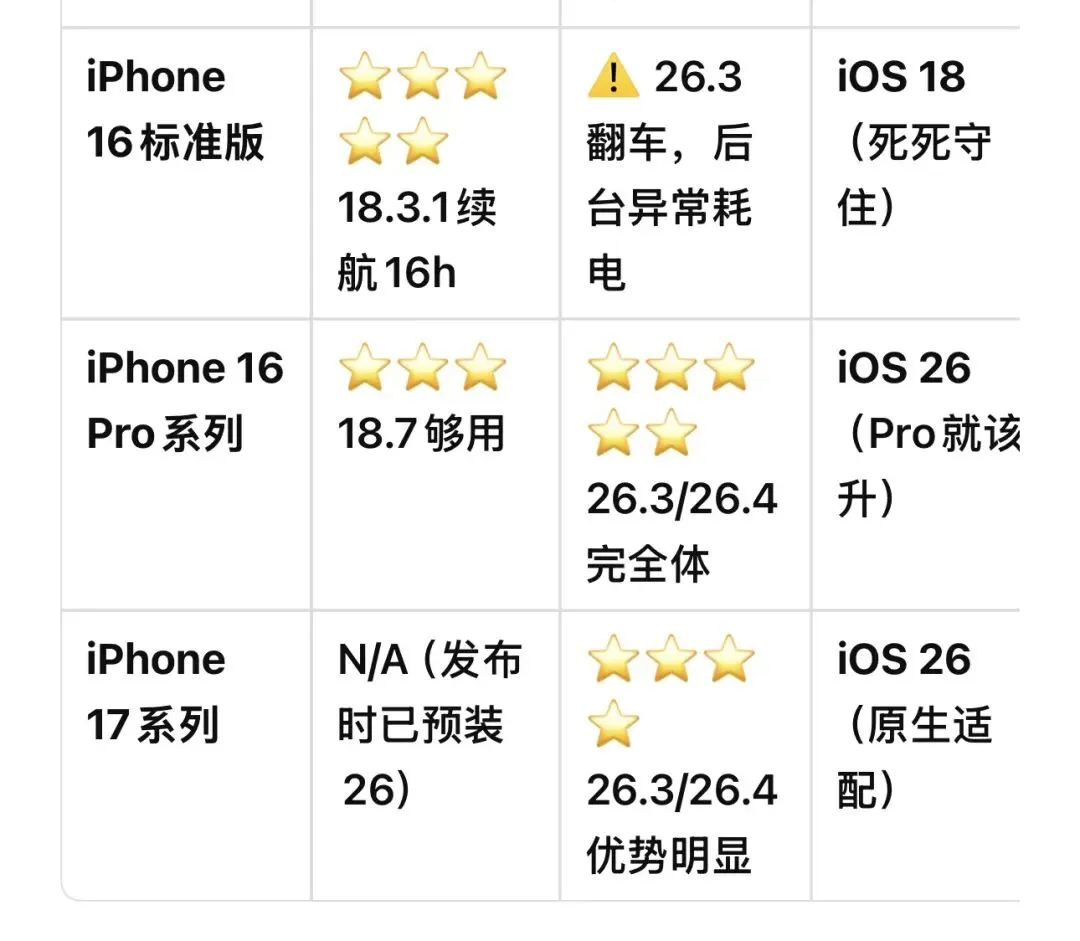 为什么不能升26:iOS 26.3红黑榜明确显示,16标准版升级后芯片与新系统调度不兼容,后台应用刷新异常,网络模块持续高功耗,待机掉电加快,重度用户需随身带充电宝。这就是典型的“新系统适配翻车”。