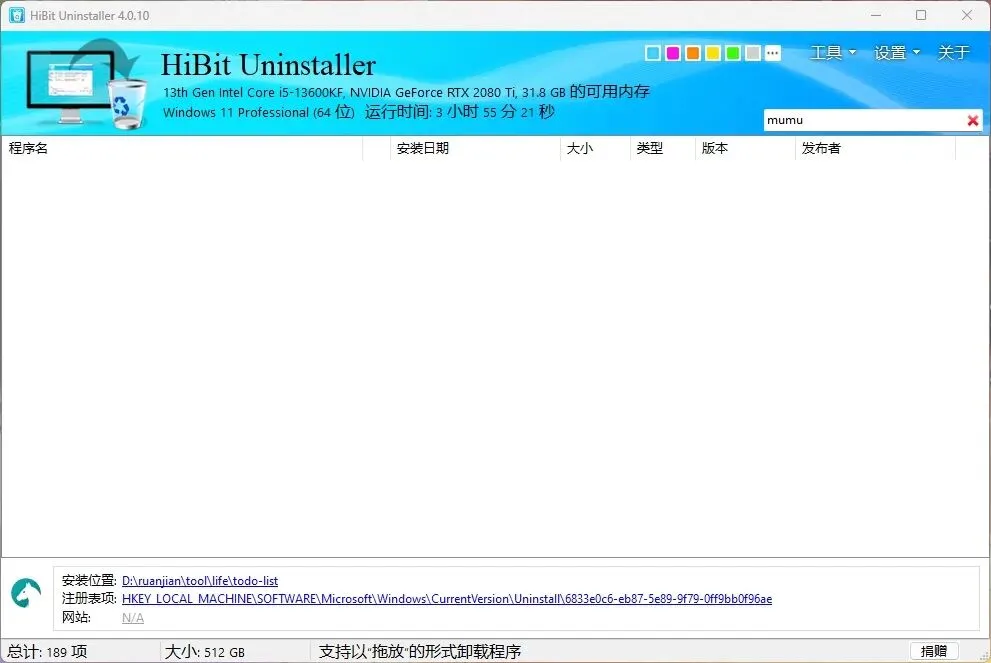 ② 用木下之前分享的卸载软件(Geek / HiBit(更推荐)),将之前安装过的“MUMU模拟器”完全卸载(如之前未安装可跳过);