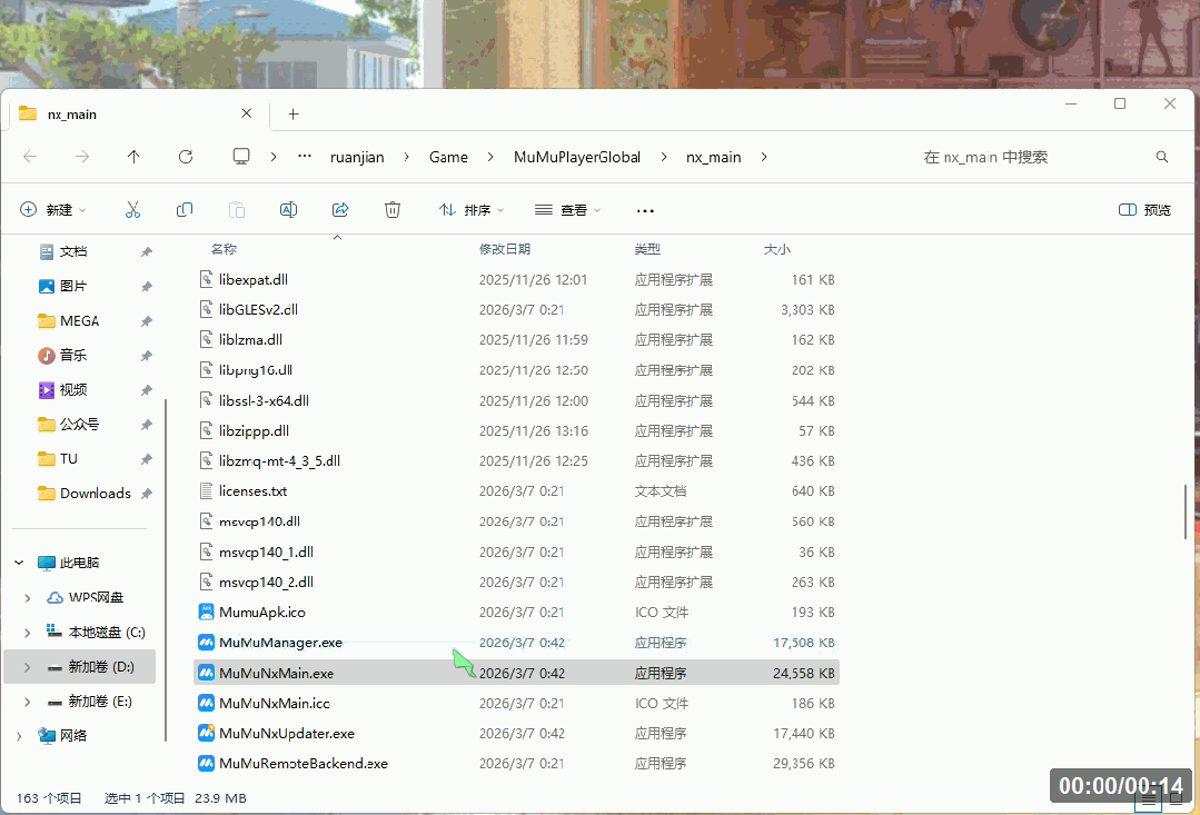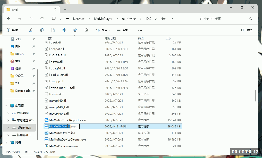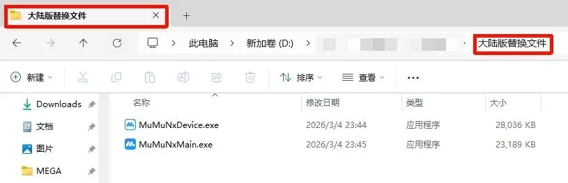 🚩4、将 “大陆版替换文件” 文件夹中剩下的的 “MuMuNxDevice.exe” 拖入刚刚打开的 “nx_device\12.0\shell” 文件夹↓