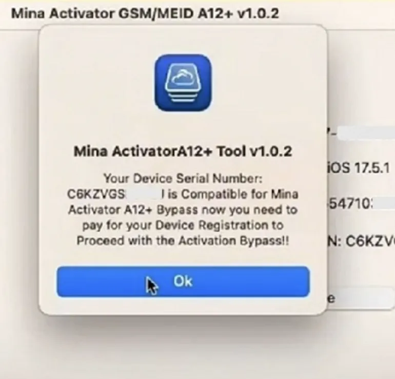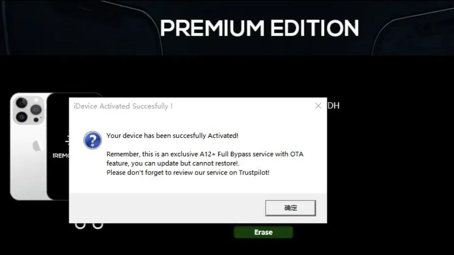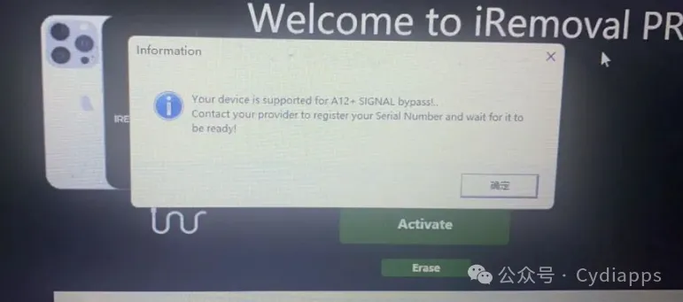 3. 下载并打开 iRemovaLPro Premium等待直到检测到设备4. 允许程序检查您的设备并获得响应"Device supported"。这意味着您的设备支持5. 提交序列号代购注册(必须出现上图提示才能注册)6. 注册需要2-5 天,注册成功后点击"Activate"7. 中途设备会重启两次,必须要等进度条走完才可拔掉8. 注意:如果您在过程中出现错误,只需等待设备重新启动,