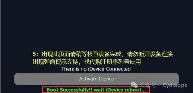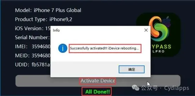 7.设备注册成功后,点击"Activate Device"开始解锁设备,等待工具提示"Successfully activated!!!iDevice rebooting"表示解锁成功,设备会自动重启,1.设备必须是原机序列号。