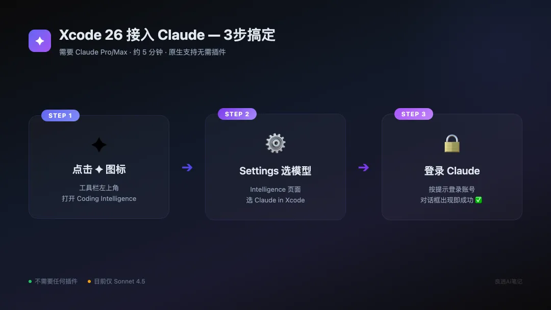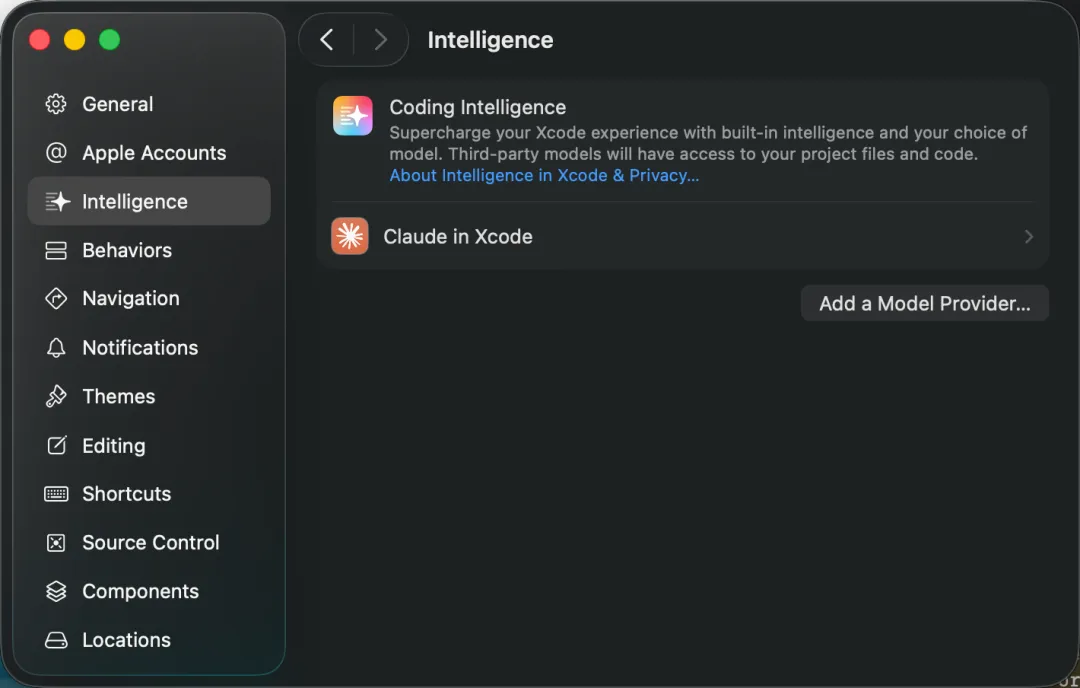 Xcode 26新增了「Coding Intelligence」,是苹果内置的AI入口,支持接入第三方模型。Claude是官方合作的模型之一,Anthropic和苹果一起上线的,不是插件,原生支持。