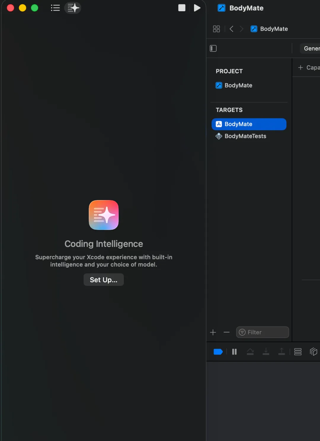 Xcode左上角多了个发光的图标,点一下,右侧弹出「Coding Intelligence」界面,有个「Set Up...」按钮。