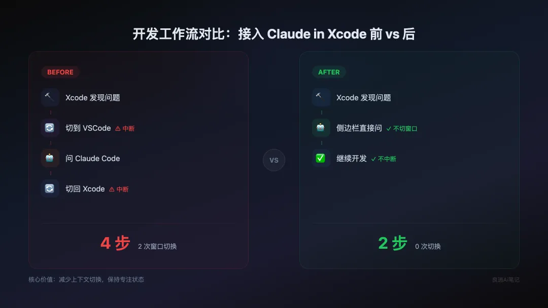 对我来说有个实际的用处:在Xcode里调试的时候,突然想确认某个模块的逻辑,直接在侧边栏问,不用切到终端或者开浏览器查文档。以前我的习惯是:Xcode发现问题 → 切到VSCode → 问Claude Code → 再切回来。现在中间少了两次切换。