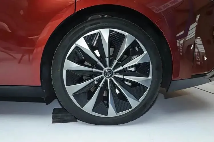 先绕车一圈看看样子。这款车长超过5米1(5130mm),轴距超过3米(3020mm),站在旁边确实能感觉到那种大车的气场,不像有些纯电车为了低风阻做得圆滚滚的,铂智7的线条还是挺有力量感的。展厅这台高配版轮毂尺寸给得很大,视觉冲击力确实强,这在以前的日系车上确实不多见,舍得给料了。