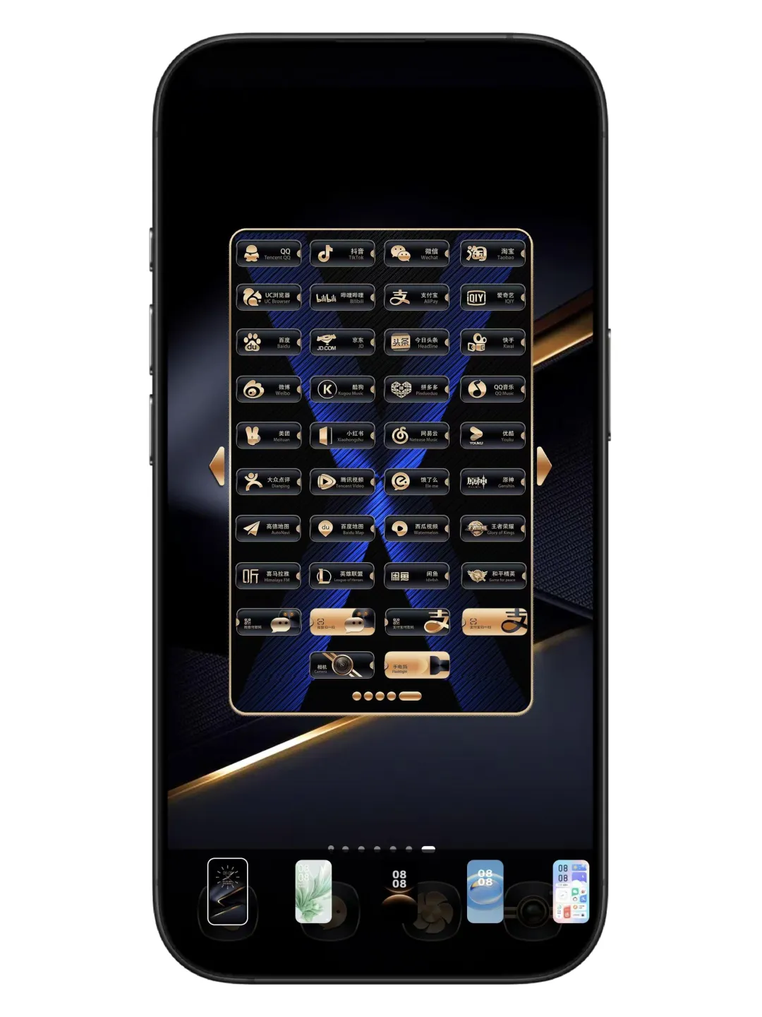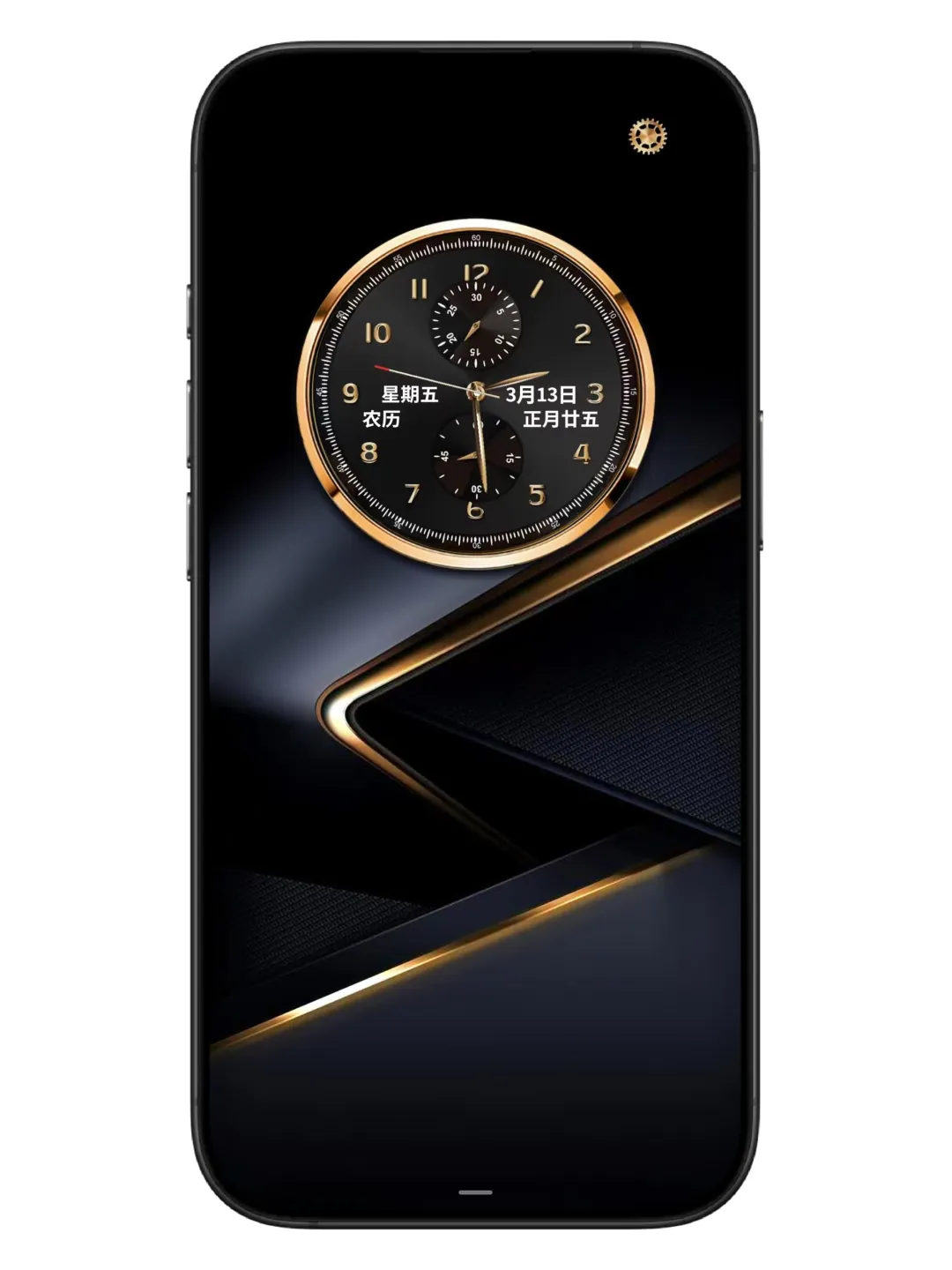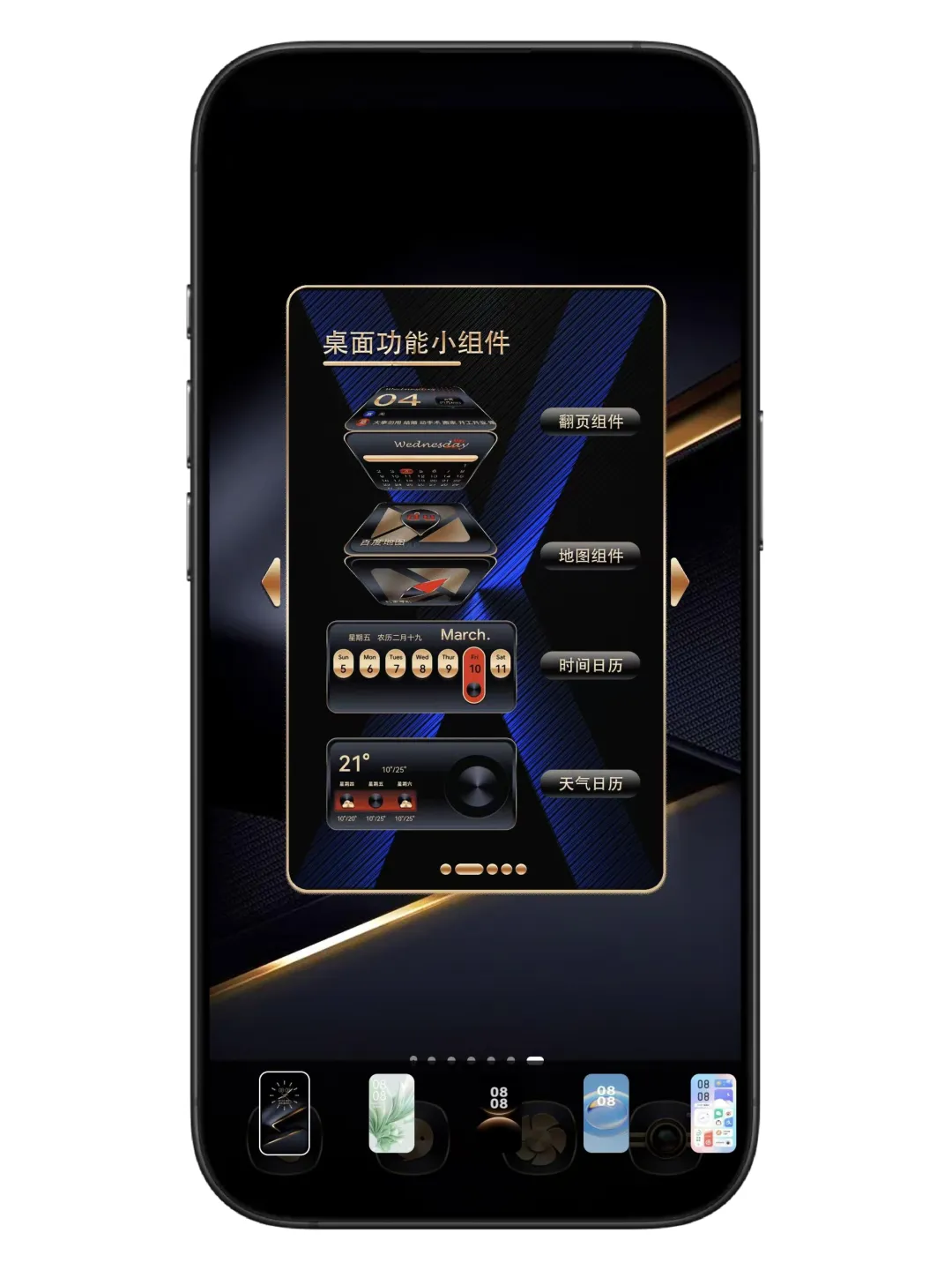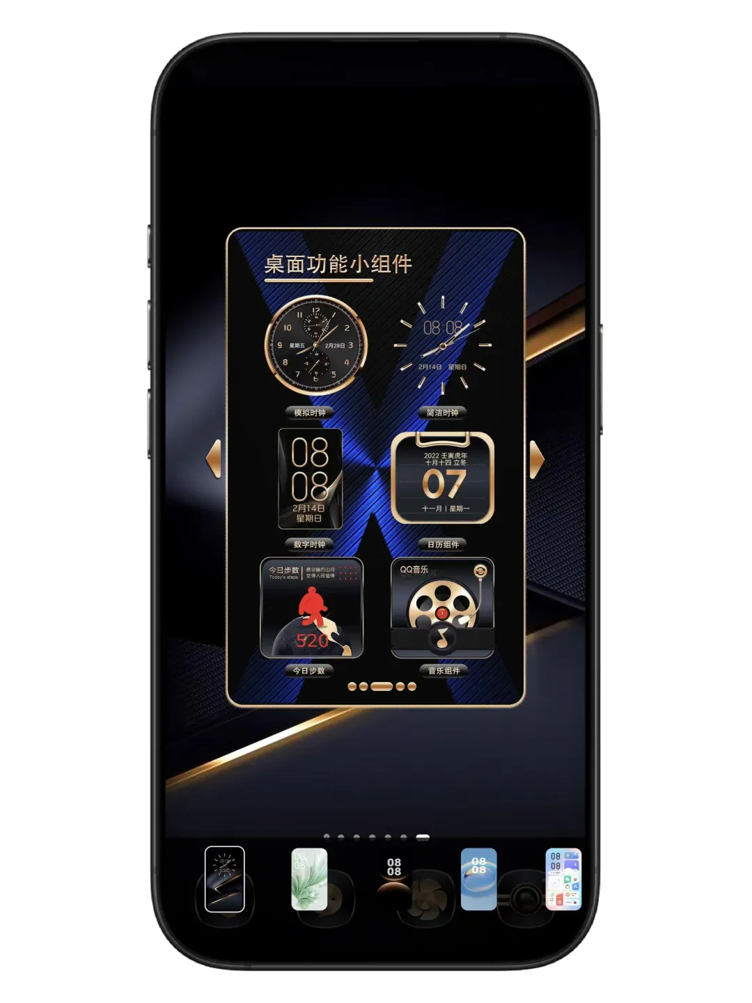 主题以深邃的黑色为底色,搭配流动的金色线条,光影交错间仿佛有流光在指尖滑过,质感直接拉满!锁屏界面的时钟设计超精致,三种样式可选:经典指针款复古优雅、数字款简约现代、还有带农历显示的中式风,每天换一种心情~解锁后桌面更是惊喜,金色边框的图标排列整齐,搭配壁纸,高级感溢出屏幕!