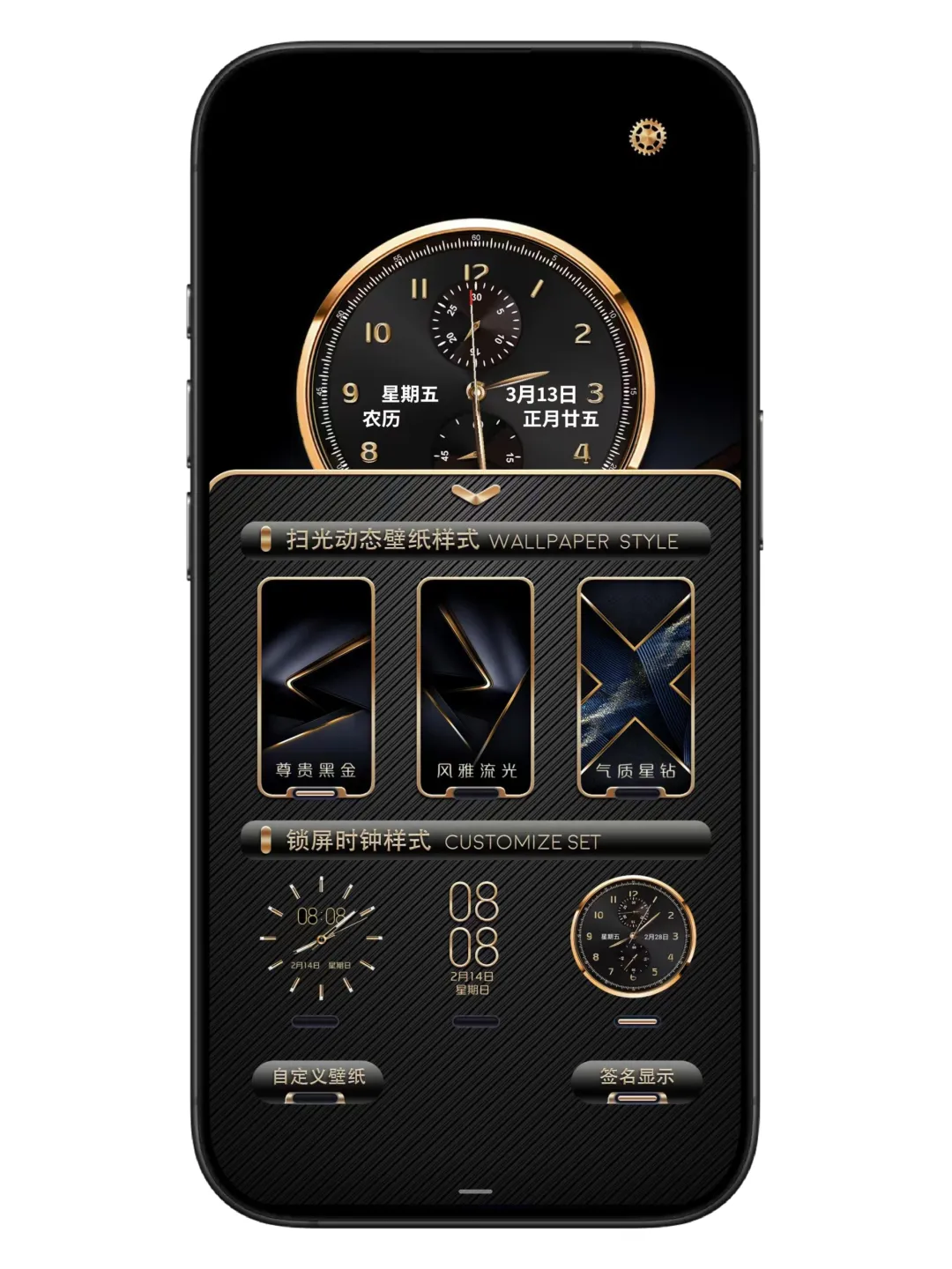 重点来了!主题内置三种锁屏壁纸动画样式:尊贵黑金、风雅流光、气质星钻」。每次点亮屏幕,壁纸都会根据时间或操作呈现不同的动态效果,仿佛手机在呼吸,科技感与艺术感融合!
