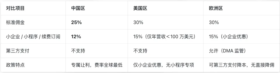 从中美欧佣金对比来看,中国区此次调整力度最为突出。调整后中国区标准佣金25%、专项费率12%,为专属优惠;美国区标准佣金仍为30%,仅年营收低于100 万美元的小企业可享15%优惠,无小程序专项费率;欧洲区受DMA监管,标准佣金30%,允许第三方支付间接降本,小企业同样适用15%费率。