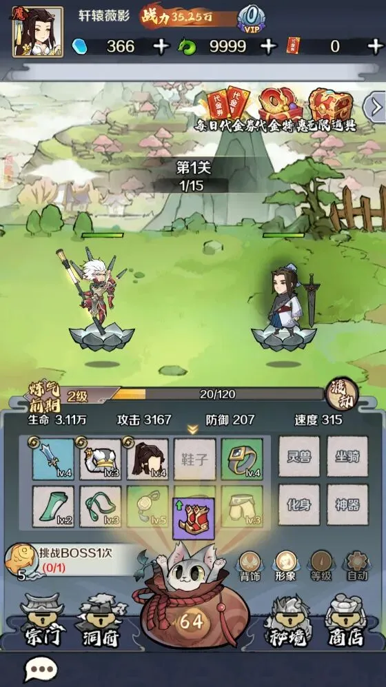 1、登陆到少年驯龙记游戏后先点击下方的猫咪百宝袋来开箱获取装备,随着任务的不断完成就会把上面的菜单激活了,这样就能领取代金了