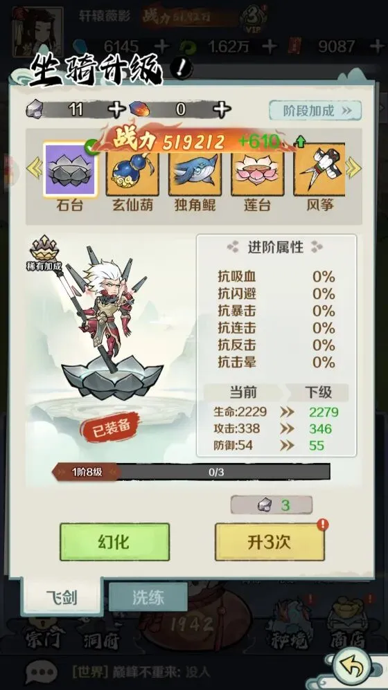 4、随着任务的不断完成玩家就可以进行渡劫升级了,每次提升境界后可以有效地增强生命、攻击、防御等属性