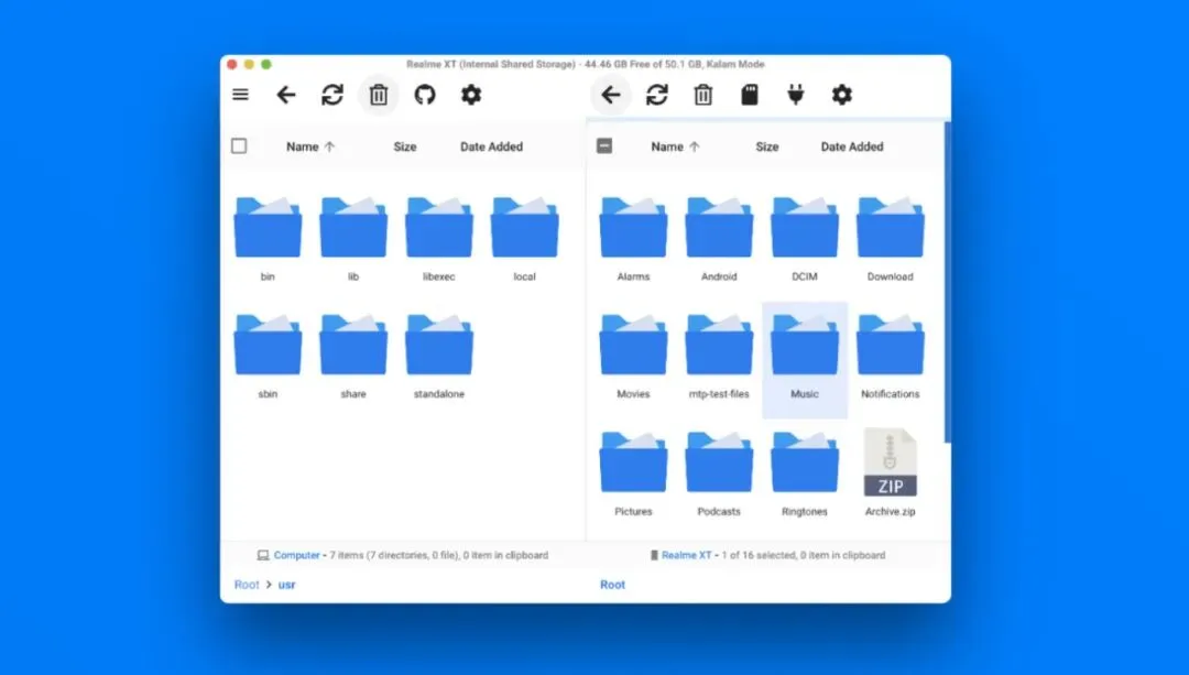 当你打开 OpenMTP 并连接上手机后,会被它简洁直观的界面所吸引。